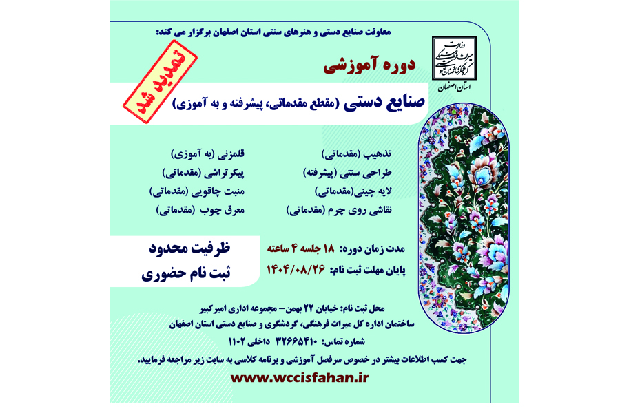 اطلاعات ثبت نام دوره های آموزش رشته های صنایع دستی-پاییز 1404